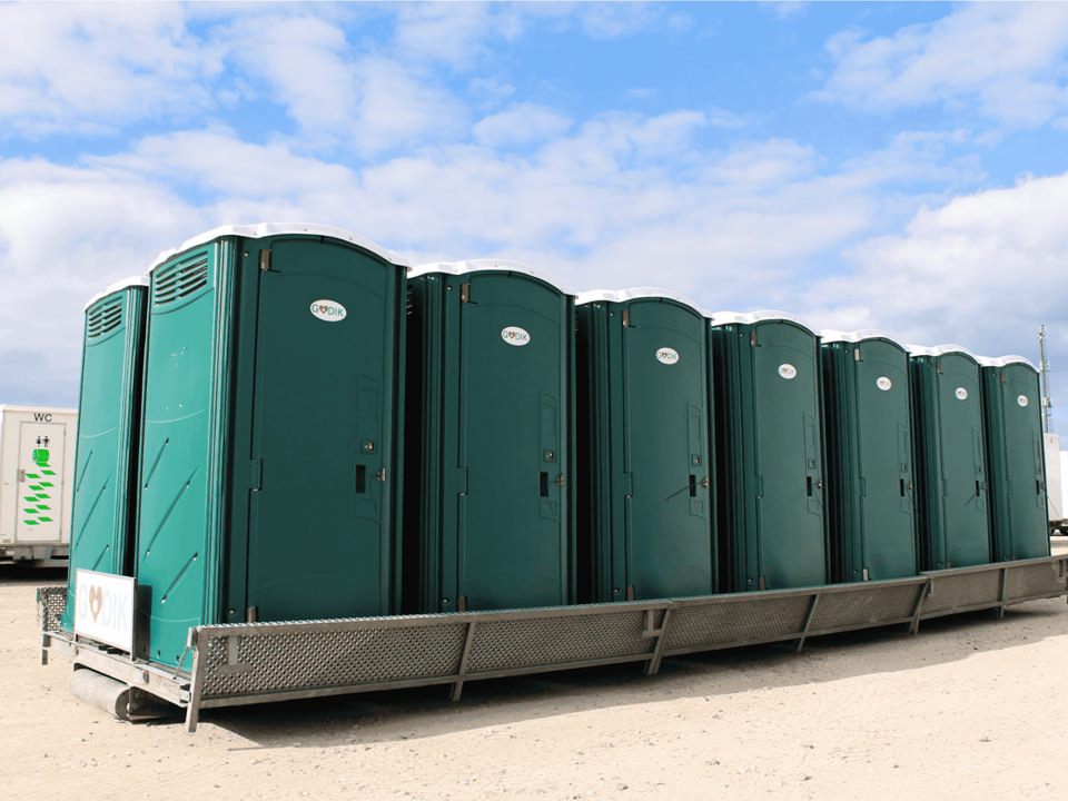 Ramme med seks toiletter og toiletbanner - ideel til festivalområder. Let at opstille og drifte med fokus på kapacitet og hygiejne. |